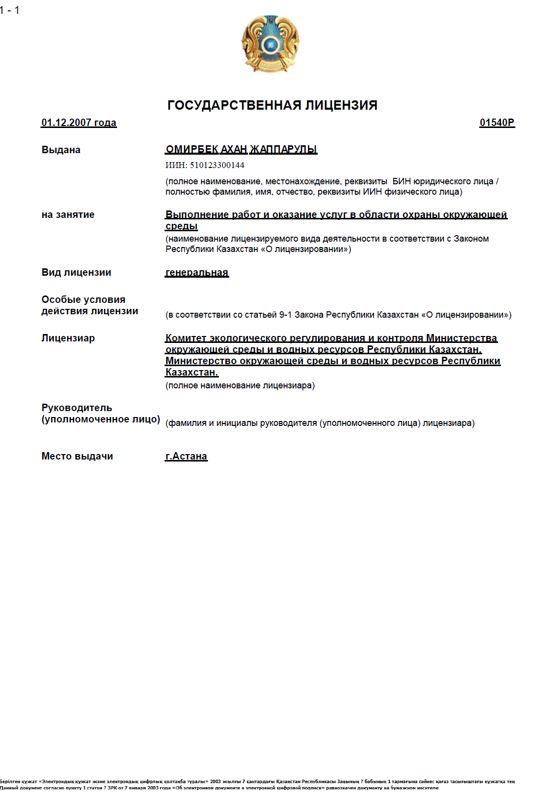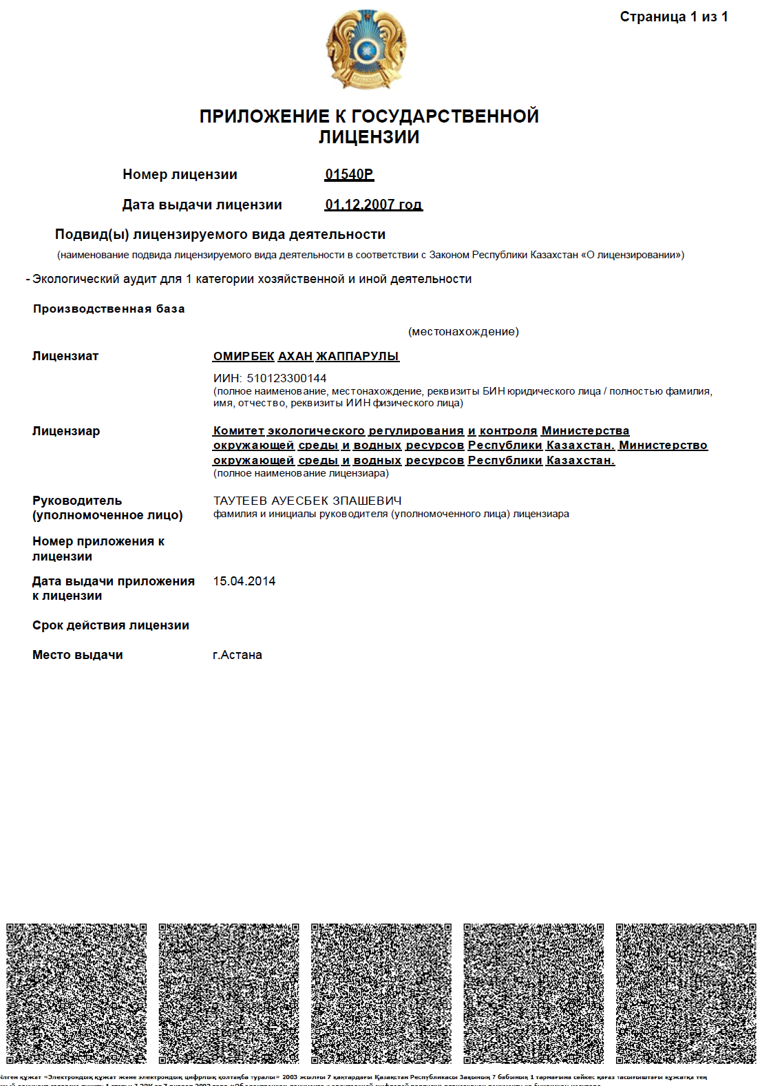 - Гос. лицензия на экологическое проектирование, нормирование и аудит предприятий I категории№01540Р