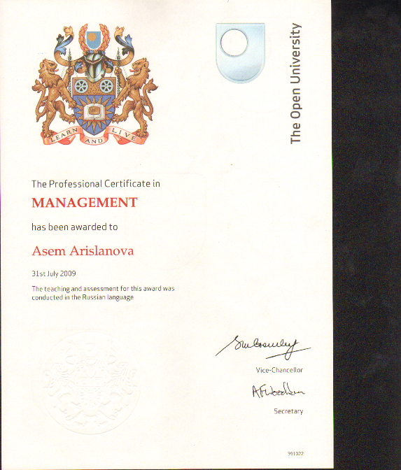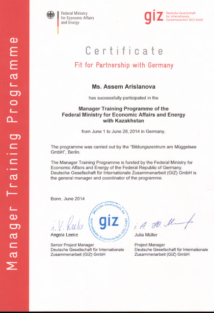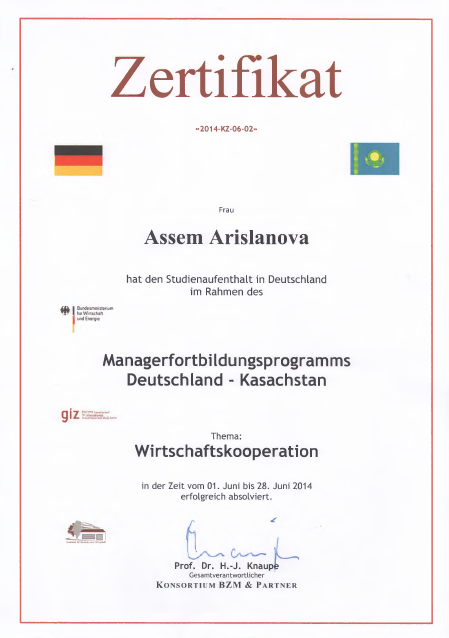 - Менеджер-профессионал (Открытый Университет Великобритании), Микро/Макроэкономика (Институт Общего Управления Турции и Центральной Азии ), Стажировка Федерального министерства энергетики ФРГ