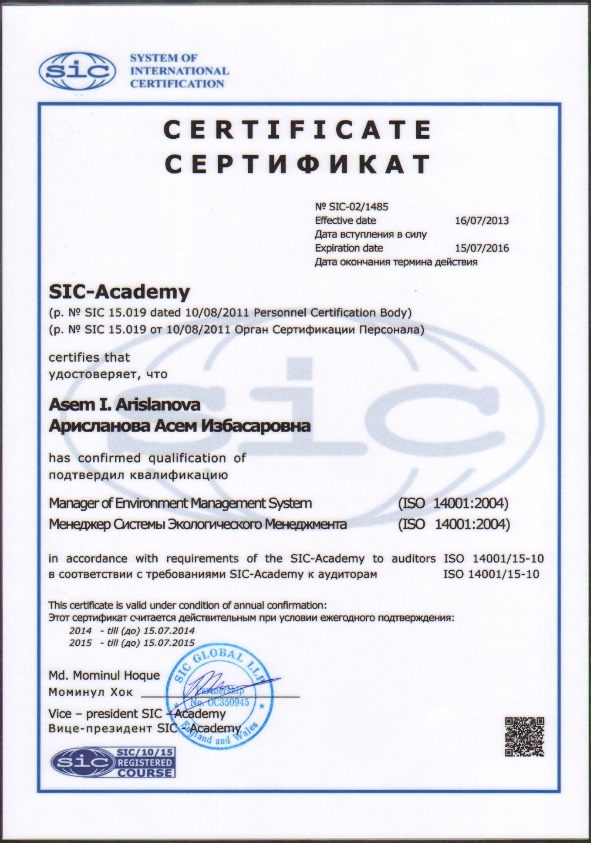 - Член Казахстанской Палаты экологических аудиторов РК, внештатный эксперт-консультант Ассоциации переработчиков отходов Министерства энергетики Германии